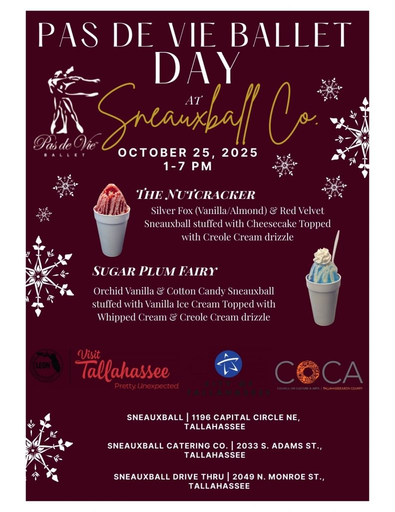 Spooktacular is back for year 10! Join us for this FREE event at the Adderley Amphitheater at Cascades Park for trick-or-treating, costumes, games, food, and a ghoulishly good concert! Be sure to stop by the Pas de Vie Ballet Booth!